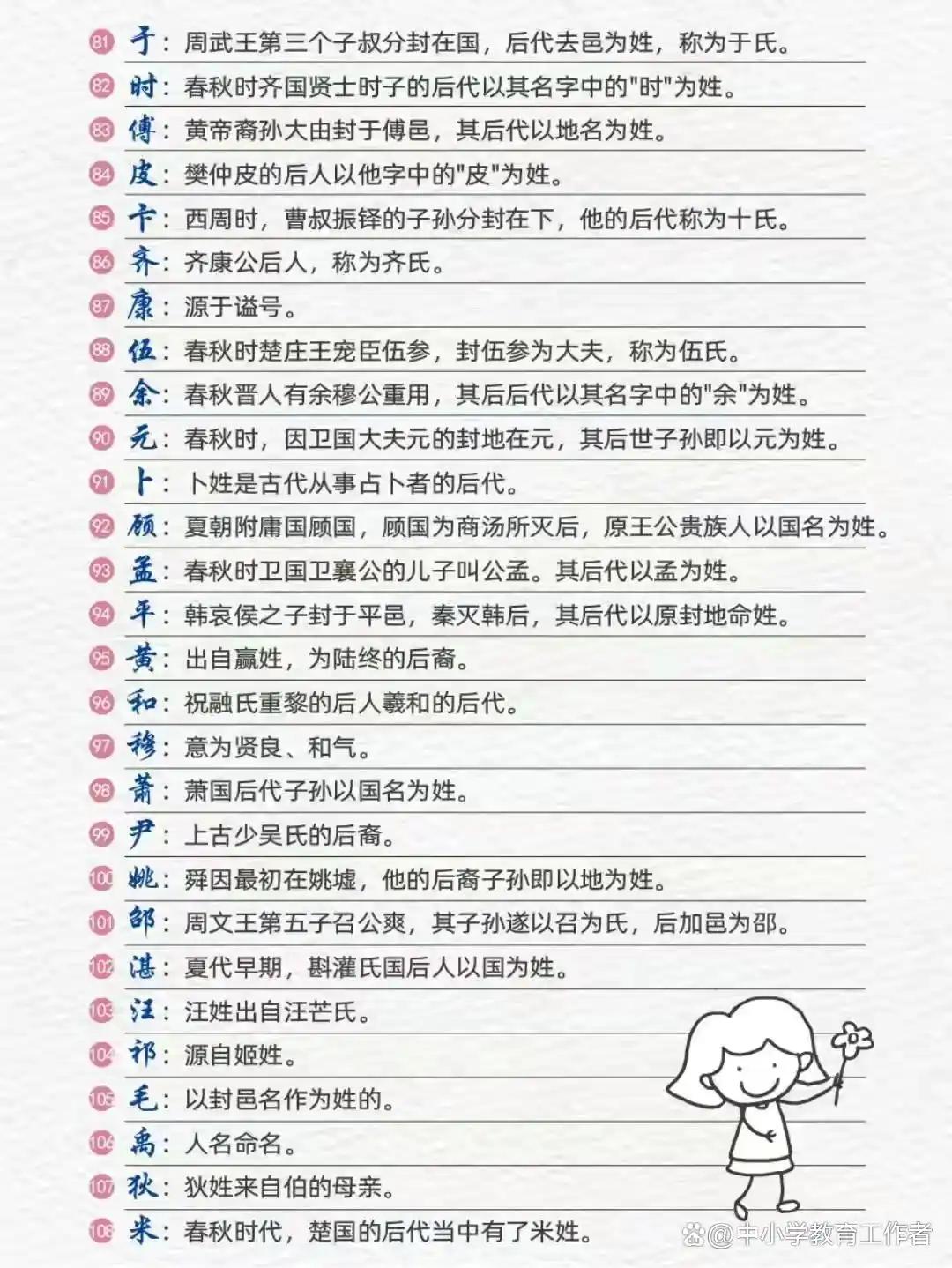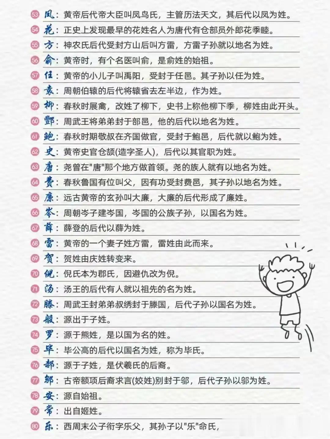 卫Wèi:周文王的第九个儿子叫康叔,建立了卫国,他的后代以国名为姓。
