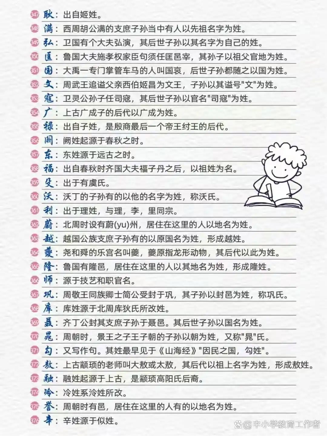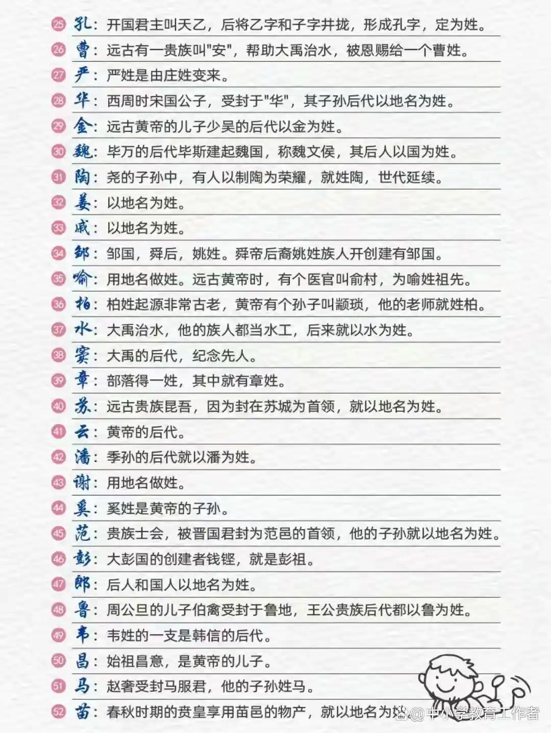 文Wén:周武王追谥父亲西伯姬昌为周文王,子孙以其谥号“文”作为了姓。