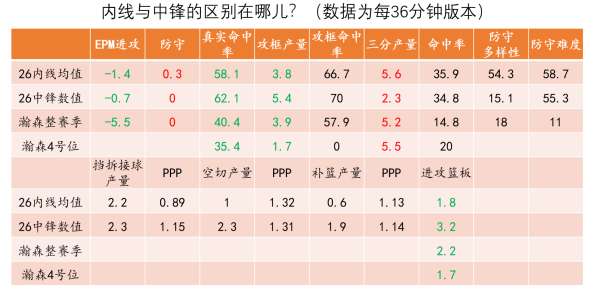 可是如果我们不以中锋的标准来要求他、而是以一个4号位的标准呢?于是我将NBA本赛季内线球员(现代篮球数据分析会采用6位置模型,其中中锋通常是只打5号位、内线是45号位摇摆人)与中锋球员的平均数据进行了对比,得到了下面这张表格,完全揭示出了瀚森现阶段打4号位的合理性: