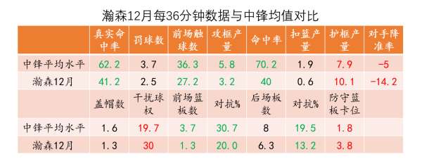 在揭晓答案之前,我们先回顾一下上一篇瀚森观察中的一个重要表格。如上图所示,瀚森目前作为中锋球员,与联盟均值水平相比在真实命中率、攻框产效、前场篮板数方面有着明显的差距,这些差距导致了瀚森无法胜任合格的中锋轮换,因此能拿到的上场时间总是较少。