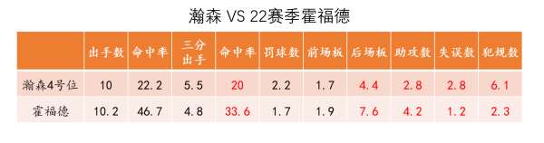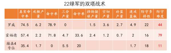 事实上,围绕罗威的双塔战术并不是本赛季才出现,早在22赛季凯尔特人时期便凭借这一招闯入了总决赛,当时罗威和霍福德可称为内线的完美搭档。在防守端,罗威更擅长扫荡而霍福德更擅长肉搏护框保护篮板。而在进攻端罗威主要提供禁区内吃饼的活力,而霍福德则是三分炮台,跟现在瀚森和罗威的比赛内容是不是很像?所以在表格中我们可以看到,瀚森目前在4号位上的攻框产量和三分产量数据与22赛季霍福德的数据是很相似的,这表明两人在双塔战术中进攻端的定位非常相似。