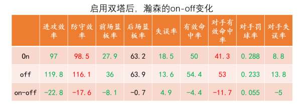 另一方面启用双塔之后,瀚森的On-off数据也产生了巨大变化,首先瀚森加罗威的双塔因为严重缺乏自主得分能力,所以球队整体的空间会必然变得拥挤,导致进攻效率、有效命中率等数值明显下滑。但与此同时,双塔所带来的防守优势也在帮助开拓者,过去七场比赛瀚森在场时对手的有效命中率仅仅只有41.3%、下滑了11.7%之多,实现了自己打不进别人也别想进的效果,在十几分钟的轮换时间里打成五五开,就会为主力球员争取大量的休息时间,保存体力收比赛,这就是开拓者近期连胜的秘诀之一。