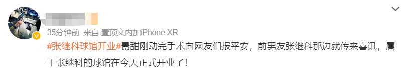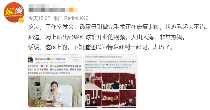 11月4日,张继科景甜这对昔日情侣一同上了热搜,悲喜不同的是,张继科开了新球馆,而景甜因为刚做完手术正在康复训练,看到两人同时上了热搜,网友的讨论度更高了。