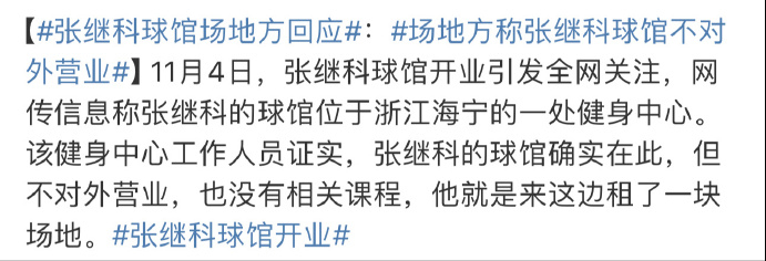 据悉,张继科的球馆位于浙江海宁的一处健身中心,该工作人员证实,张继科的球馆确实在此,但不对外营业,也没有相关课程,他就是来这边租了一块场地。