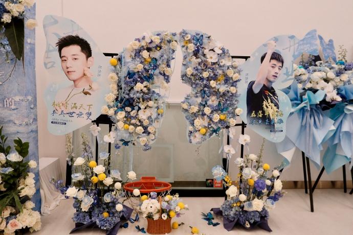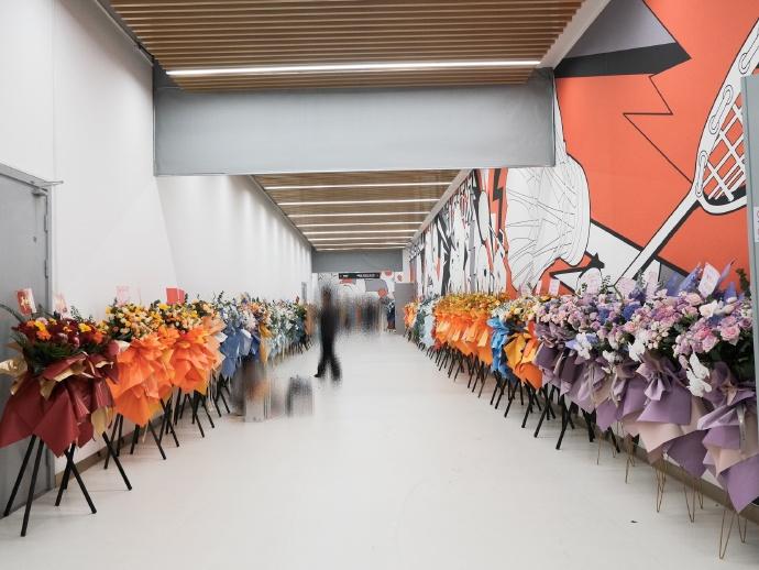 还有很多粉丝送去了花篮,整齐地排在球馆里,从球馆大门口到球馆内部,两条通道全都是花篮,款式样式都一样,一看就是粉丝提前商量好预定的,非常漂亮。