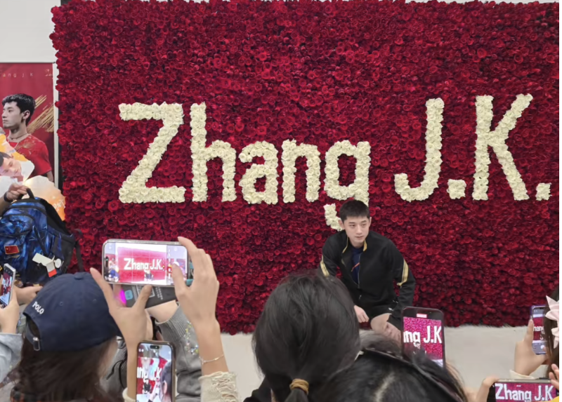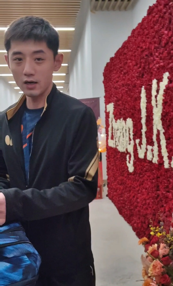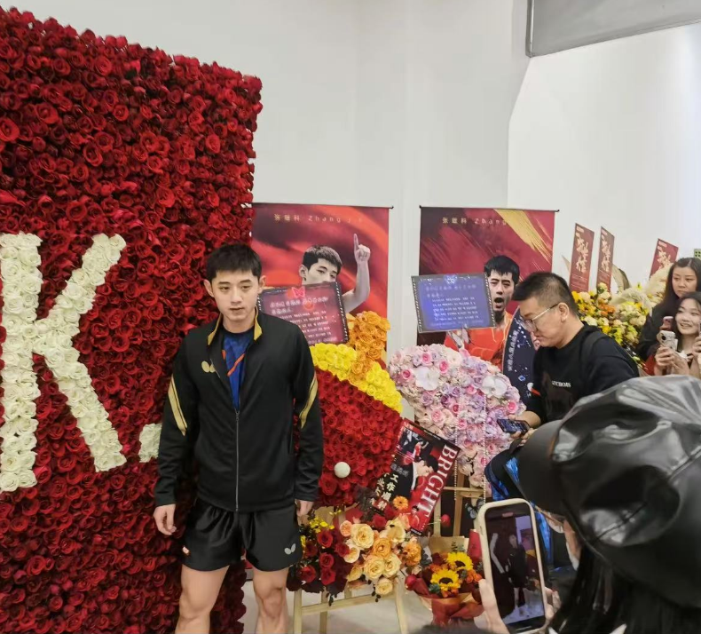 粉丝还用玫瑰花做了一个超大的乒乓球拍,还制作了很多海报,易拉宝宣传,真是用心了。