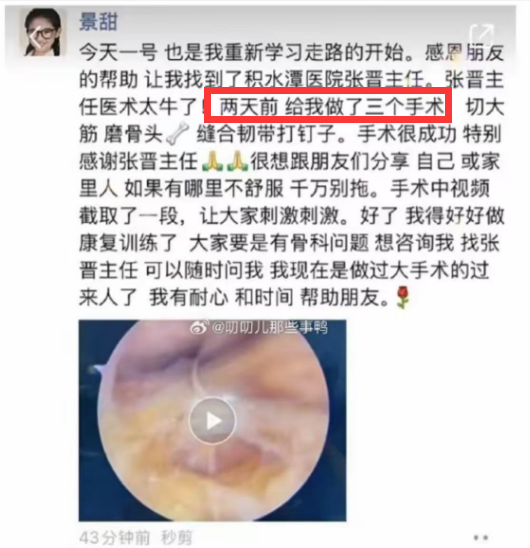 景甜还告知她康复需要3周左右的时间,之后就可以正常工作了,让大家不要太担心她,有网友曝光了景甜的朋友圈,告知她两天前做了三个手术,还透露了相关细节,看她说的怪轻松,一定很疼吧。景甜还说自己或家里人如果有哪里不舒服了,千万别拖。