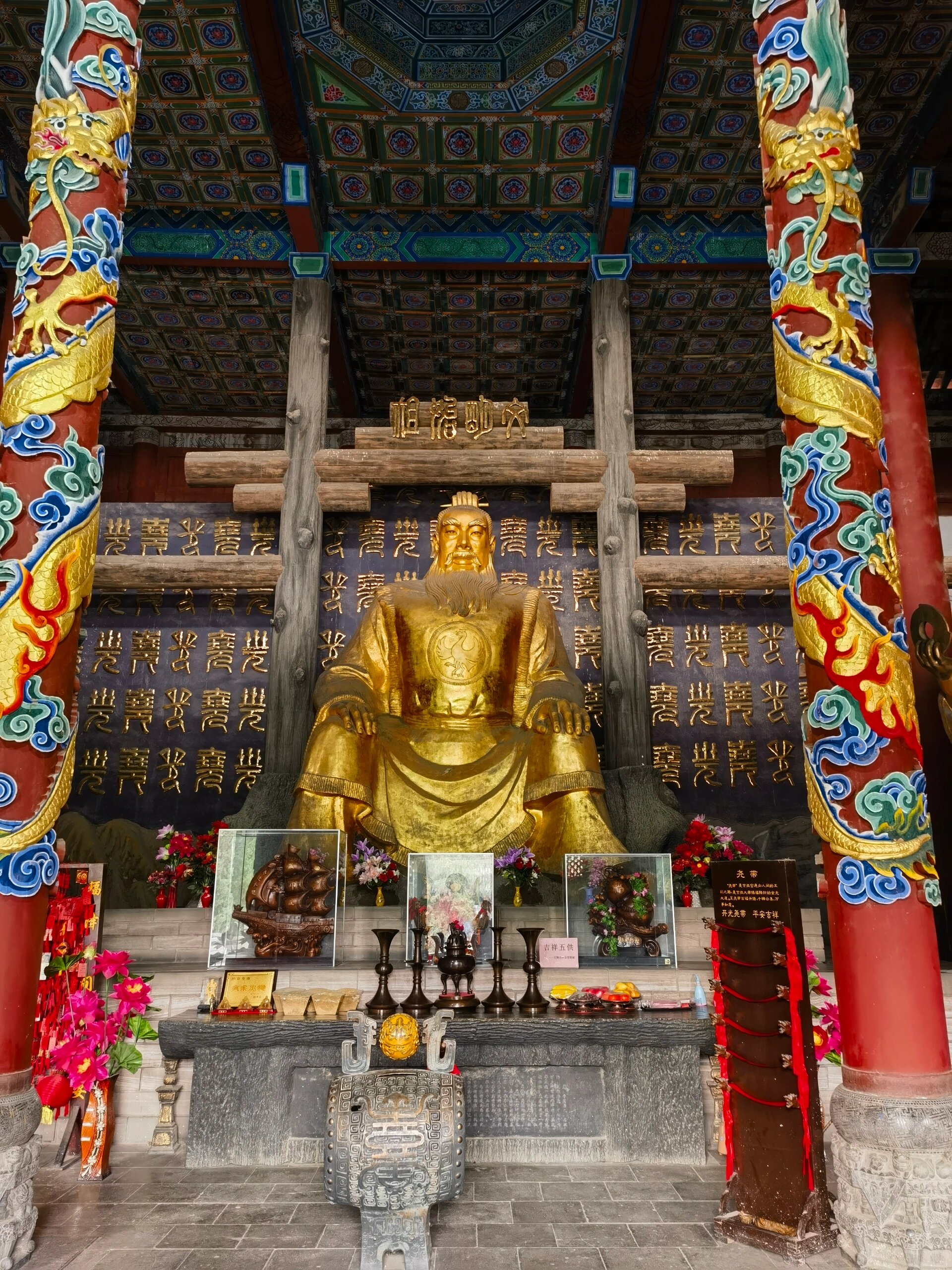 寝宫“尧舜禹三圣像”:明代泥塑彩绘(高4.8米),尧帝手持“谏木”、舜帝抚琴、禹王持耒,衣纹用“曹衣出水”技法;
