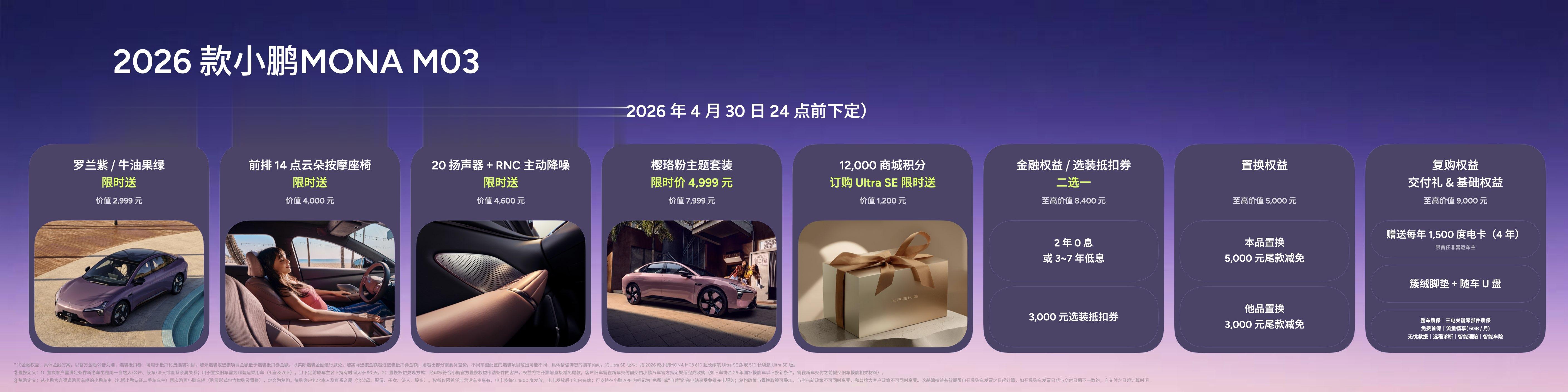 品牌同步推出上市专属权益,即日起至2026年4月30日24点前下定2026款小鹏MONA M03,限时送至高价值超35,000元权益。