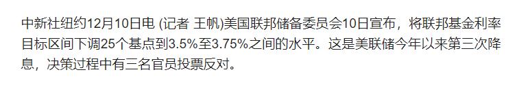 这次降息后,美国联邦基金利率区间落到3.5%至3.75%。对比今年年中还死死钉在5%以上的利率,短短几个月就退回“三字头”,单看宽松力度其实不算小。