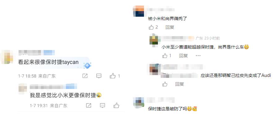有网友认为该款车外形与小米汽车、保时捷相似,戏称尚界Z7为“保时界”,还制作了三款车的对比图。而尚界官方在此前的直播中,明确提到Z7的外观可以“比肩欧洲某款百万级性能车”。