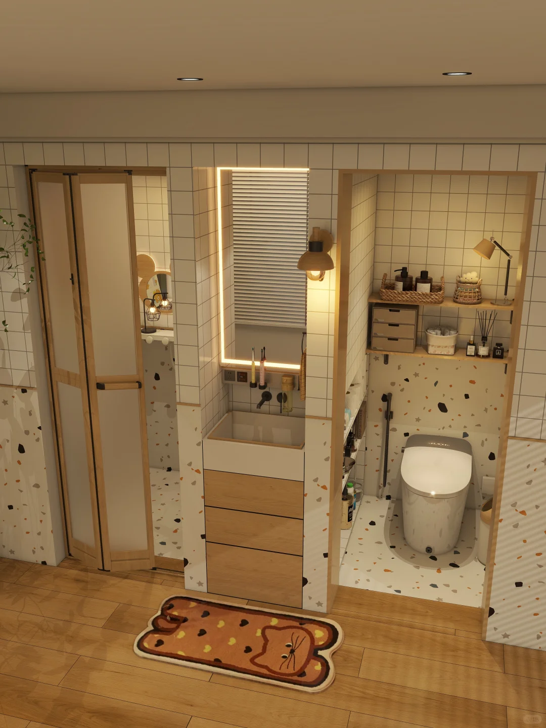 这种设计可以让家庭成员可以在同时使用卫生间的不同区域,就是比如,妹妹在洗漱,哥哥在上厕所,爸爸在洗澡、妈妈这时也同样可以使用洗衣区。