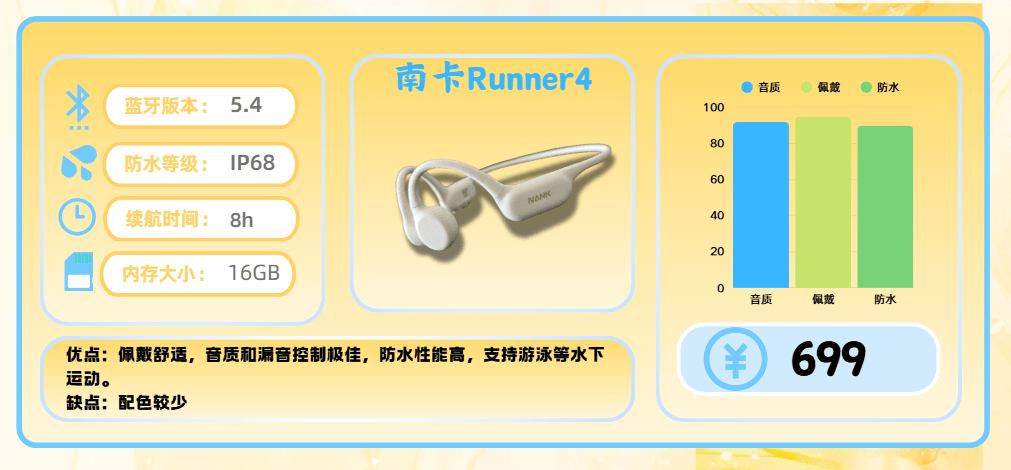 南卡Runner4拥有IPX8的高防水等级,无论是日常运动时的大量出汗,还是在雨天进行户外运动,甚至是游泳等运动场景,它都能轻松应对。