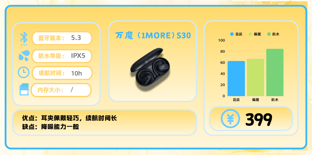 1MORE S30 是万魔推出的一款入门级开放式耳机,整体定位偏向轻量与易用性。机身重量控制得较好,佩戴时存在感不强,长时间使用也不容易产生负担,更适合作为首次尝试开放式耳机的选择。整体配置以实用为主,音质表现处在同级产品的中上水平,能够满足日常通勤、散步或轻度运动等场景的基本需求。