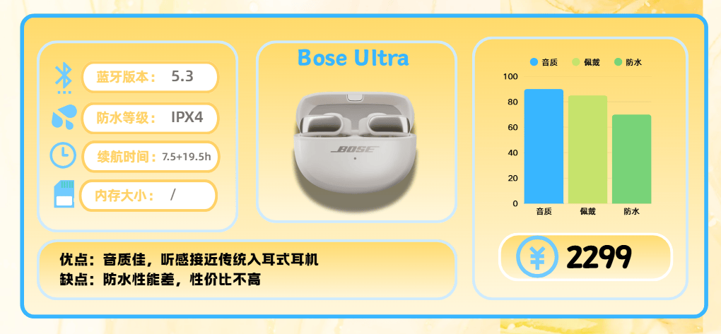 Bose 作为音频领域深耕多年的品牌,在调校与技术积累方面一直较为稳定。Bose Ultra Open Earbuds 是其首款采用耳夹式结构的开放式耳机,整体重量较轻,佩戴时贴合耳廓,长时间使用也不容易产生明显负担。外观设计走简洁路线,造型具有一定辨识度,兼顾了日常佩戴的实用性与观感。防水等级为 IPX4,可应对汗水和轻微溅水,但并不适合在雨水较大的环境或涉水场景中使用。