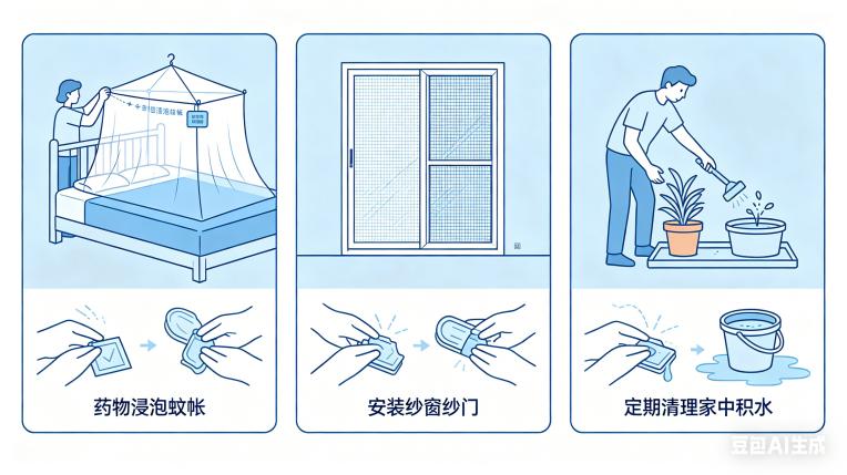 ②重视家庭防护:使用蚊帐(药物浸泡蚊帐效果更佳)、安装纱窗纱门,定期清理家中积水(如花盆、水桶),减少蚊虫滋生。