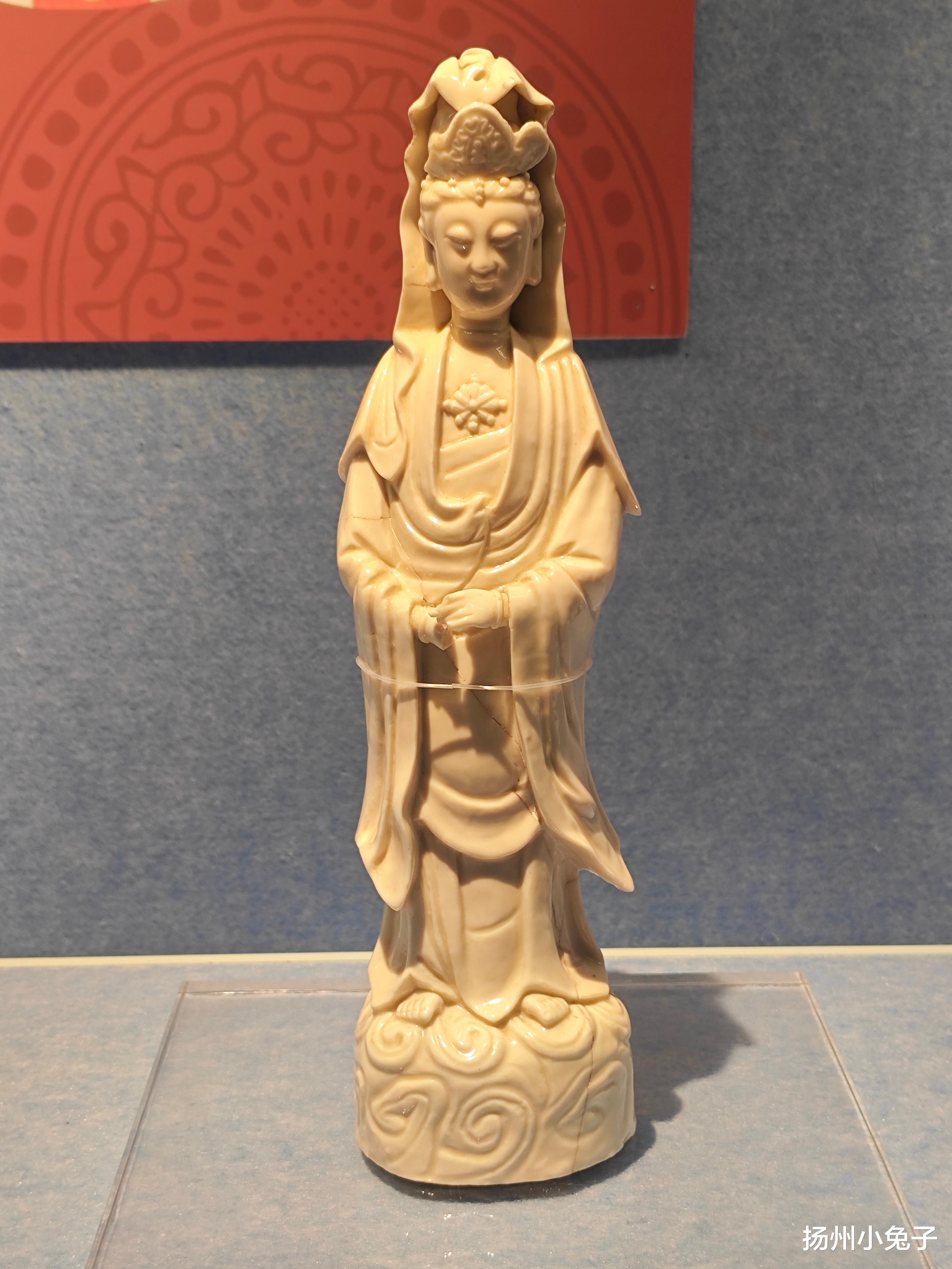 德化窑烧制的,不是生活用品,而是以佛教人物形象为主的瓷塑艺术品。展厅里,端庄的观音塑像,造型优美,神态逼真,仿佛只要对着念一声“大慈大悲观世音菩萨”,她就会翩翩走到你面前,温婉地颔首。