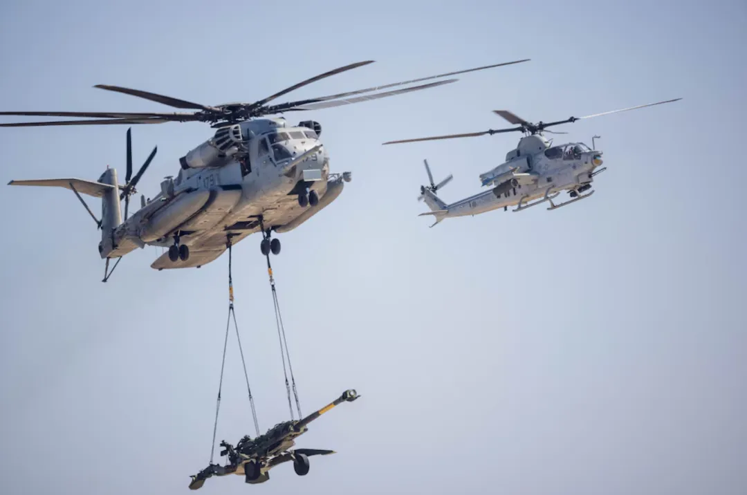 CH-53E运输直升机吊挂第11陆战团的M777榴弹炮,旁为AH-1Z武装直升机