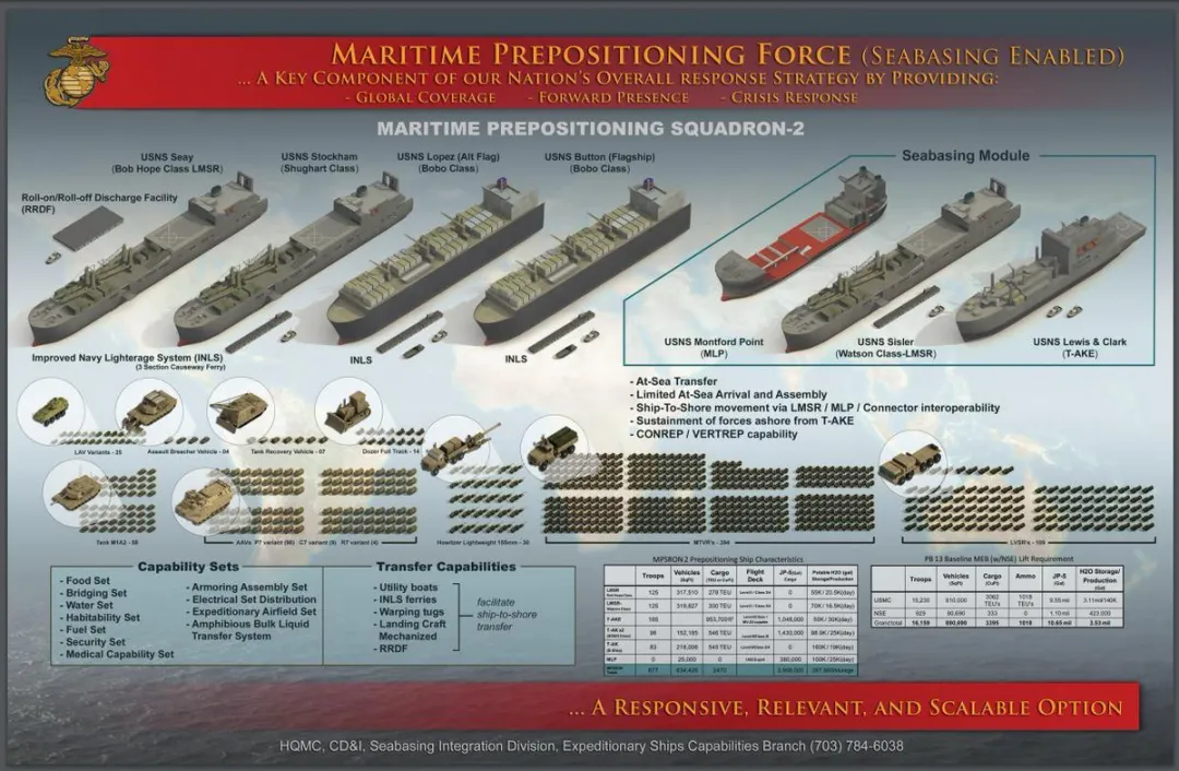 目前正停泊在迪戈加西亚的第2海上预置分队(MPSRON-2)还没有算进来。美军有在热点地区附近前置装备与补给的习惯。该海上预置分队包括“巴尔多梅罗·洛佩兹”号(T-AK 3010)、“威廉·R·巴顿中士”号(T-AK 3012)、“弗雷德·W·斯托克汉姆”号(T-AK 3017)、“约翰·U.D.·佩奇”号(T-AK 4543)、“爱德华·A·卡特二世”号(T-AK 4544)、“塞伊”号(T-AKR 302)等运输船。该中队运载着一个海军陆战队两栖远征旅(MEB)15000人的装备,以及其作战30天所需弹药、燃料和补给。