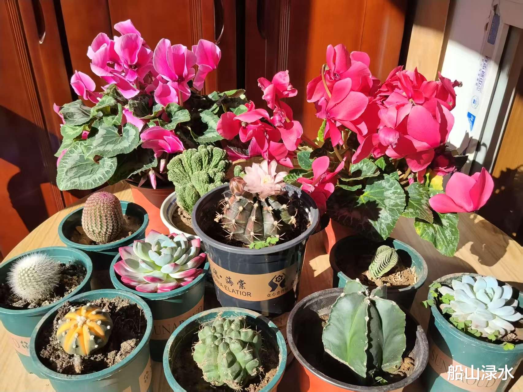 中间那盆开花的仙人球叫绯花玉。它不甘寂寞,也争春,大冬天里,也绽放!