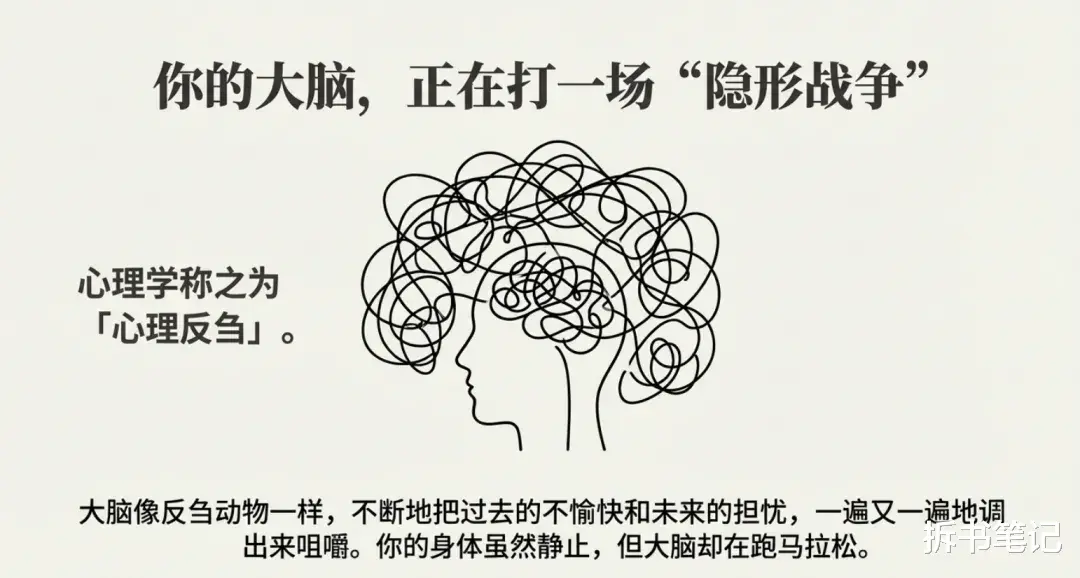 意思就是,你的大脑像反刍动物一样,不断地把过去发生的不愉快、未来可能发生的灾难,一遍又一遍地调出来咀嚼。