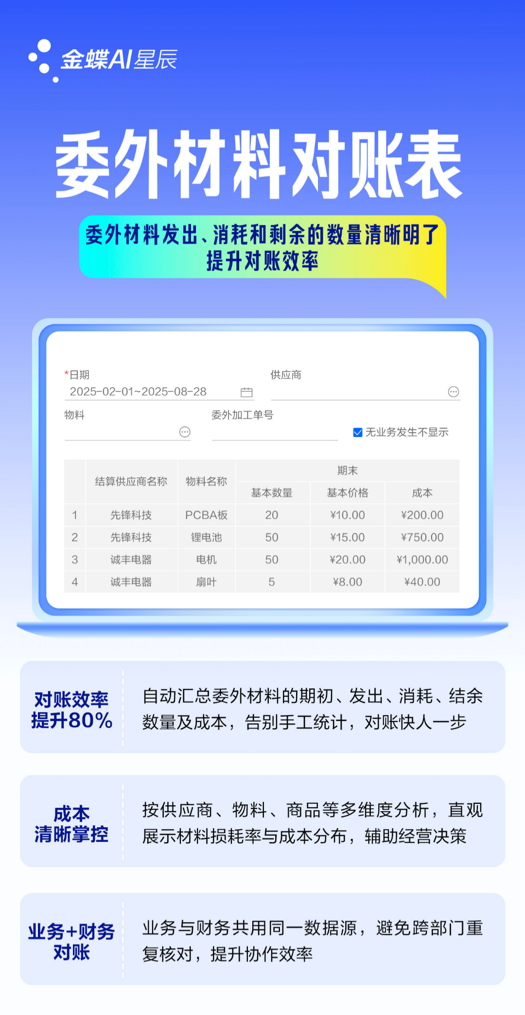 如今,金蝶AI星辰「委外材料对账表」正让这一难题成为历史。
