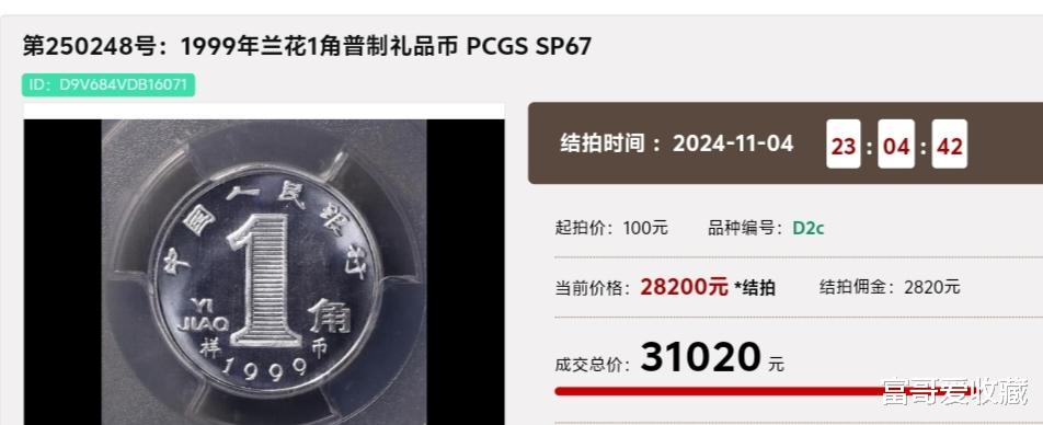 在2024年11月4号的“春秋大拍”中,一枚1999年的“兰花1角”普制(礼品币),NGC评级分数67分,最后拍出了36510.1元。