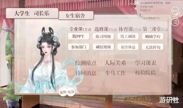 《深宫曲》的个人养成界面,也被网友重新做成各种版本。技能中的音律、舞技、才学、刺绣,被替换成专业课、选修课、体育课、第二课堂。可以安排的事务从“练习音律”“殿内休息”变成了“做PPT”“刷短视频”。