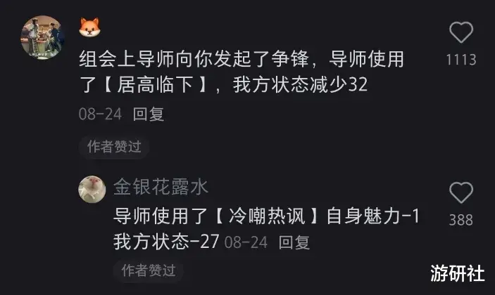 宫斗游戏的环境中通常有着等级秩序划分,需要勾心斗角,处理与妃嫔之间的关系,讨好更高地位的皇帝、太后,规训更低品阶的宫女太监。对应到现代生活里,很容易将“君臣关系”类比为“领导”和“打工人”,“学生”和“老师”;其他“妃嫔”就成为了“同事”和“同学”。