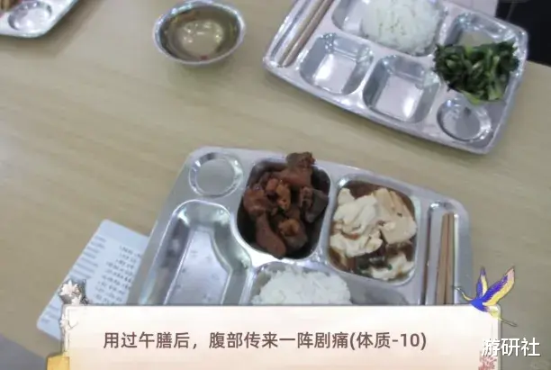 在食堂吃到难吃的饭菜,但除了吃好像也没别的选择,于是写下“中午感到饥饿,食用食堂饭菜,不久感到腹痛(金币-8、体质-10)”