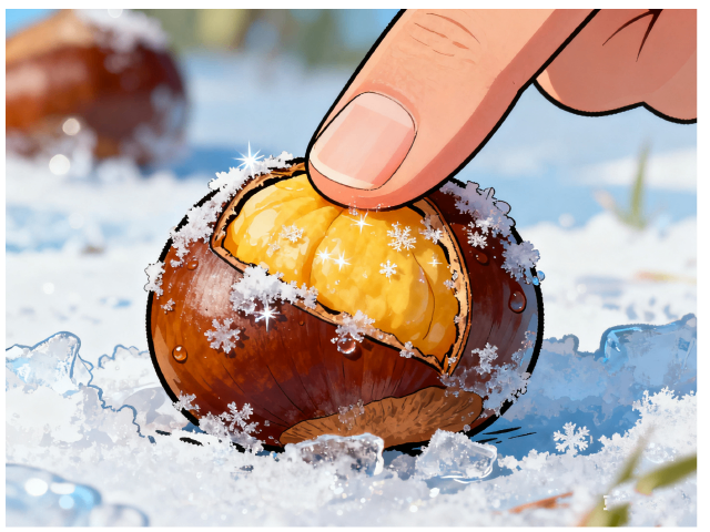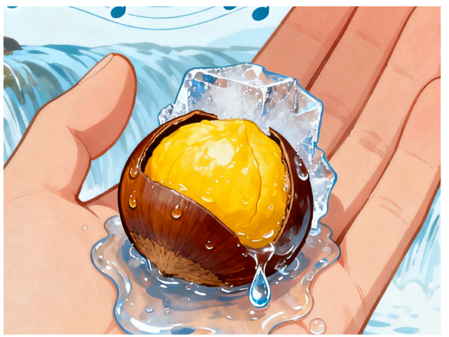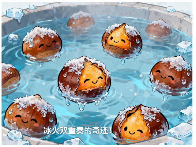 年轻板栗炫耀冰霜新装:“看我这身水晶铠甲多帅气”。老板栗淡定自若:“经历过冰火两重天才是真修行”。突然有个调皮板栗,藏了一小块冰晶:“我是会爆凉的小惊喜”。