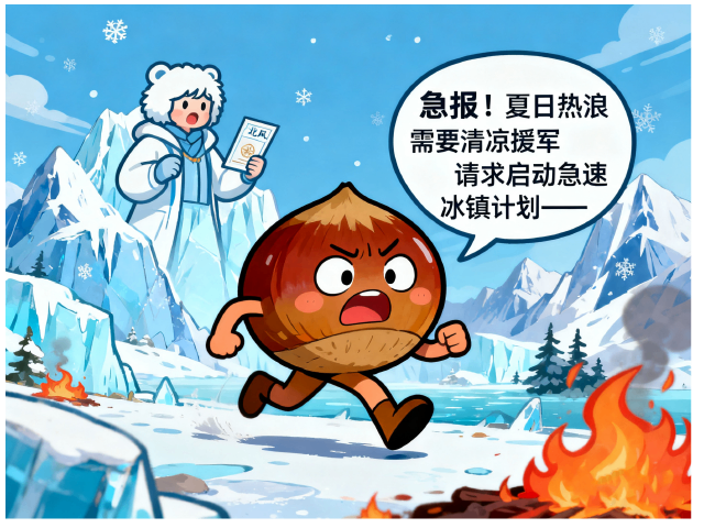 穿着深褐盔甲的板栗勇士,从炭火战场紧急撤退:“急报!夏日热浪需要清凉援军”,“请求启动急速冰镇计划——”