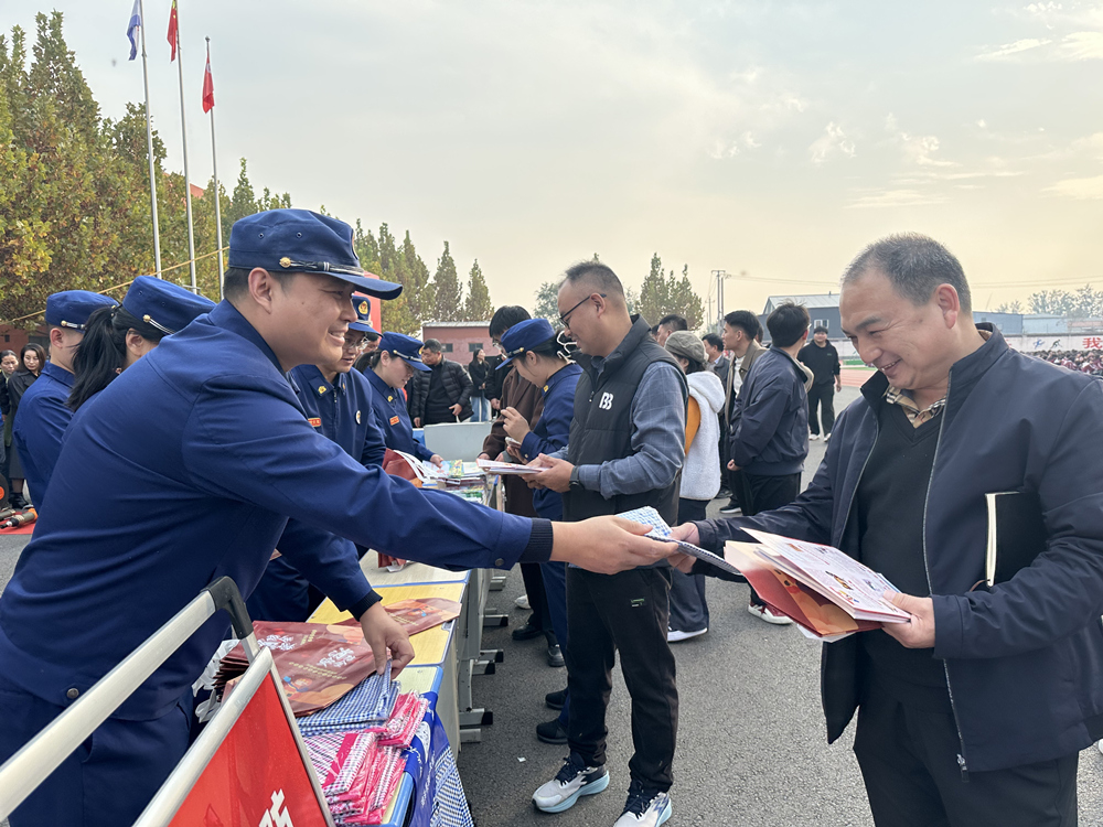 消防员正在给与会人员发放消防安全宣传资料。高利娟摄