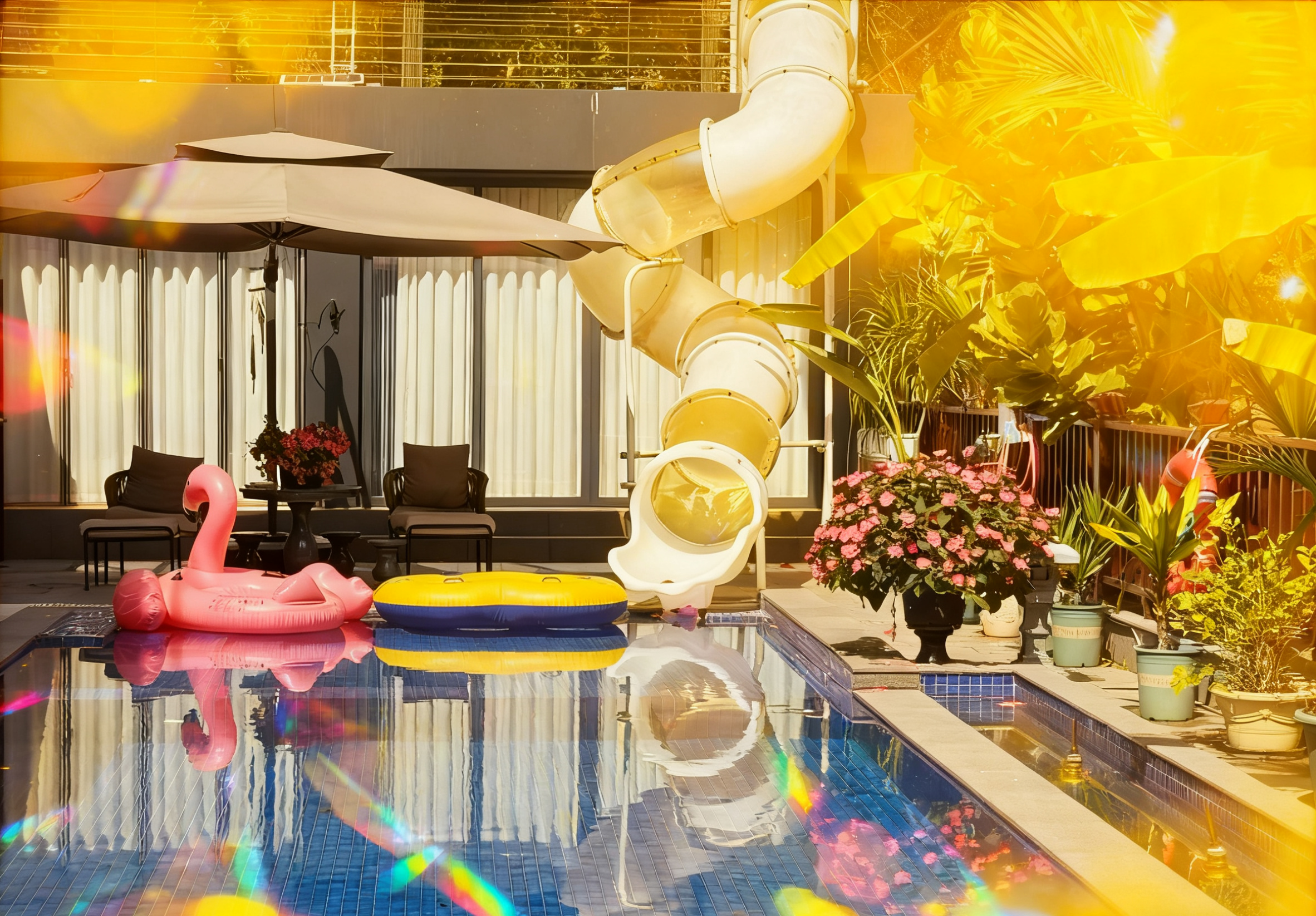 最让我惊喜的是“专属感”带来的自在。有天下午突然下暴雨,我们没法出门,就把投影仪搬到泳池旁的廊下,一家人窝在沙发上看老电影,孩子趴在栏杆上看雨珠砸在泳池里溅起的水花,时不时伸手接几滴雨水,完全不用顾虑“会不会吵到别人”。而之前住度假村时,孩子稍微跑快一点,就会被服务员提醒“保持安静”,那种拘谨感,现在想起来都觉得压抑。