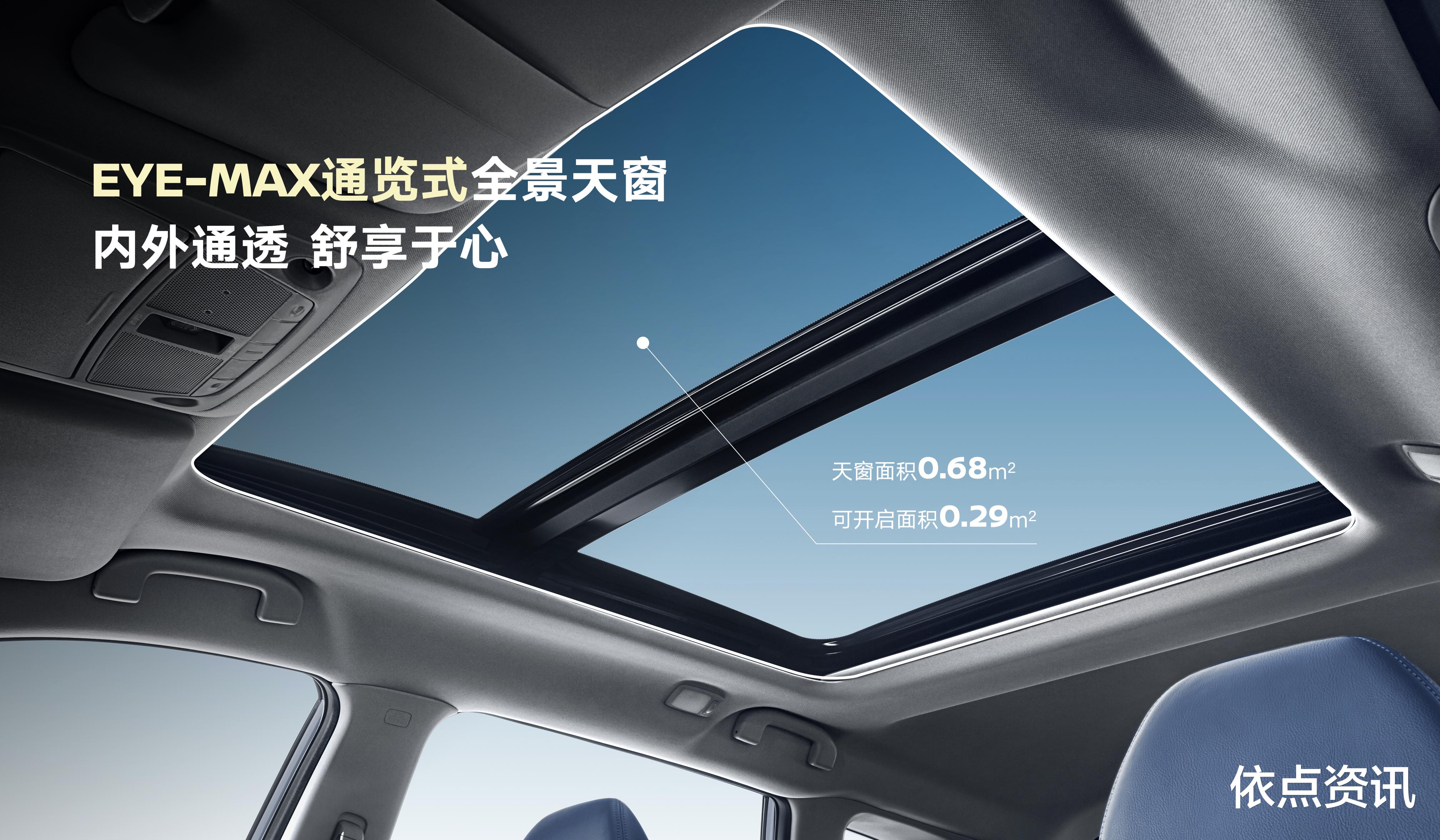 0.68 平方米 EYE-MAX 通览式全景天窗可开启 0.29 平方米,搭配 100% 全遮光电动遮阳帘,让车内时刻保持通透与舒适。