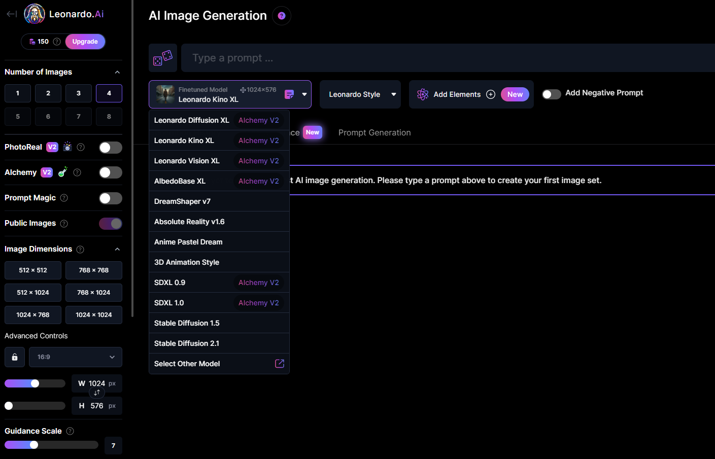 进行基础配置,选择大模型,可以看到有Stable Diffusion,还有Leonardo.Ai自己的大模型等。