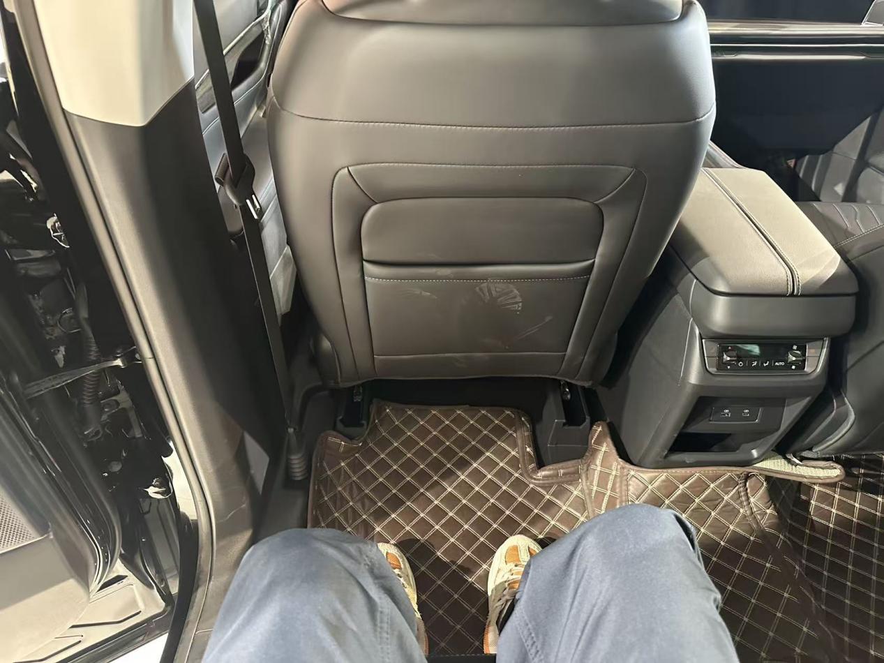 我特意去第三排试了试,以我1米75的身高,在第二排留有一拳腿部空间的情况下,坐到第三排,膝盖刚好顶到第二排椅背,但还不至于特别憋屈,短途应急或者坐小孩是完全没问题的。比很多同尺寸但采用232布局的SUV的第三排要实用得多。销售小哥说顶配旗舰型的第二排座椅更奢华,用的是和某些百万豪车同款的半苯胺真皮,我们过去摸了摸,确实手感更细腻柔软,不过考虑到预算,至尊版的皮质已经相当不错了。