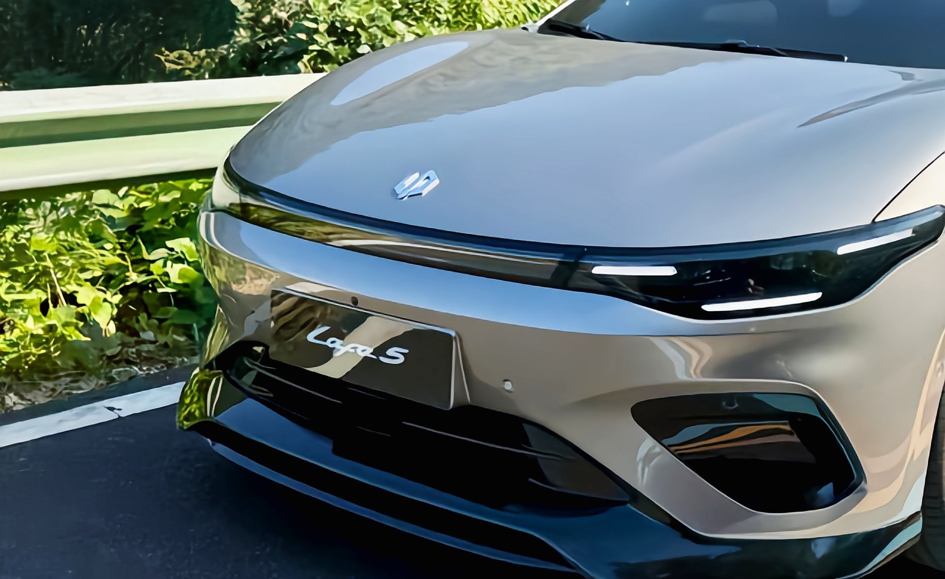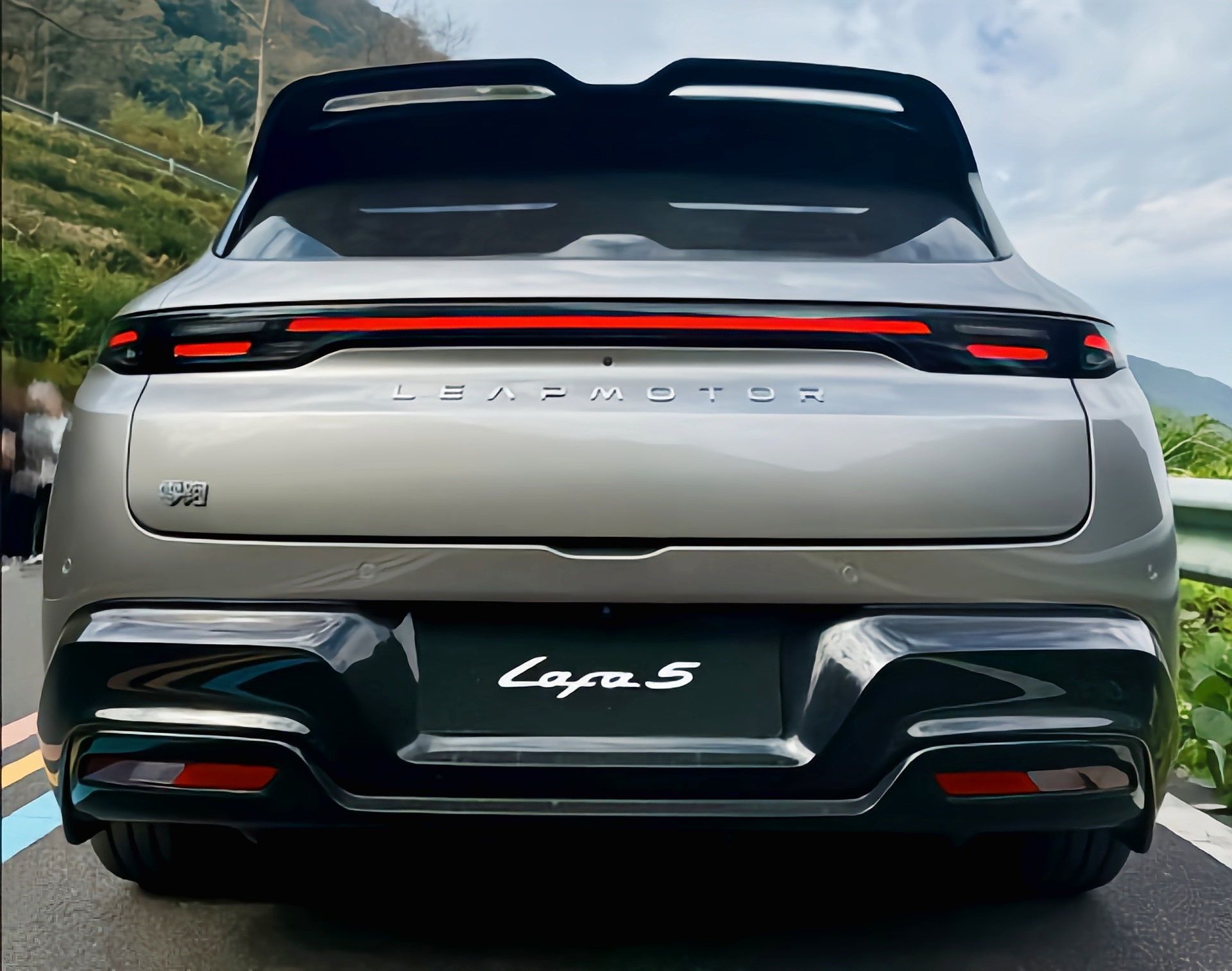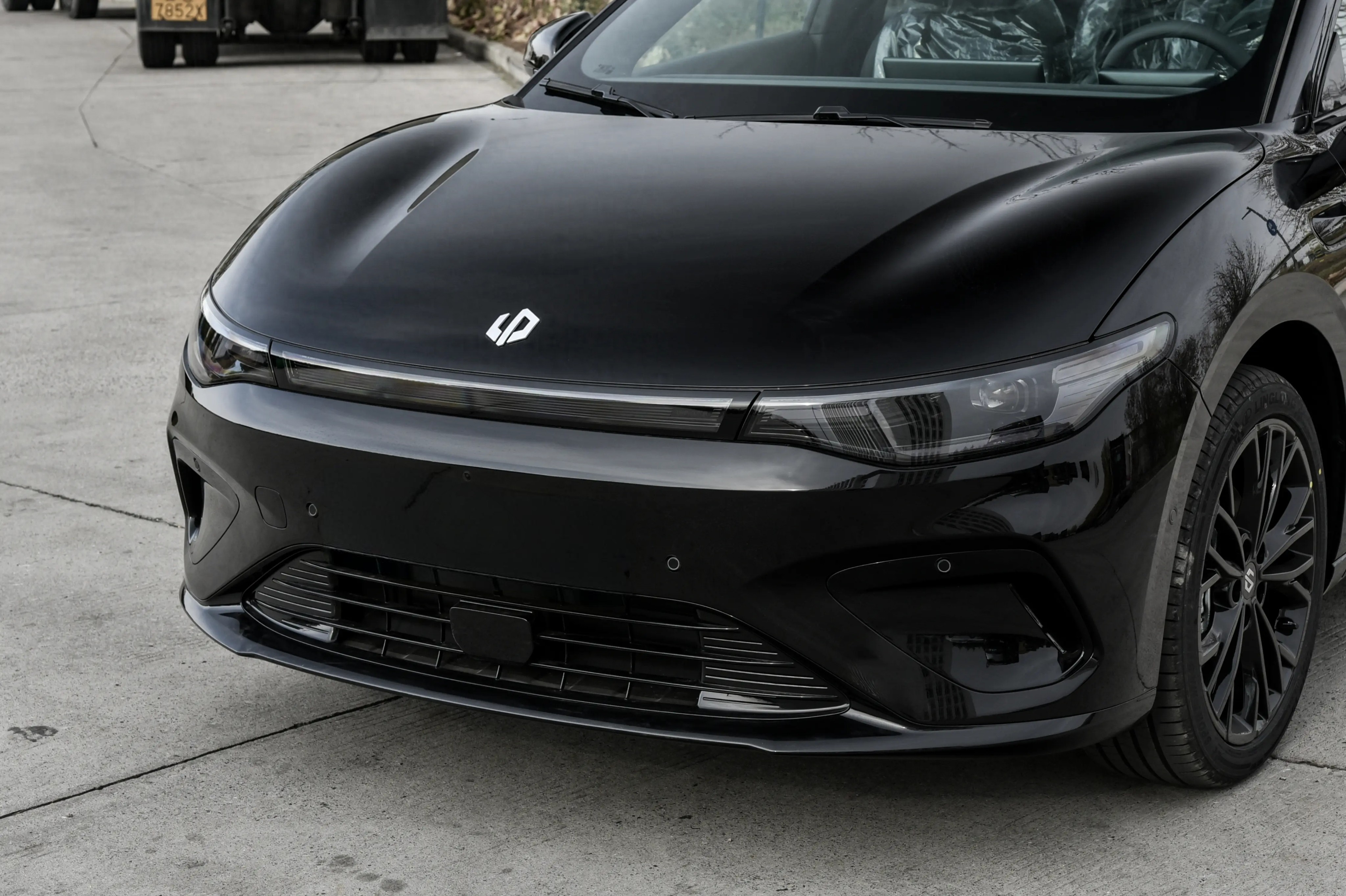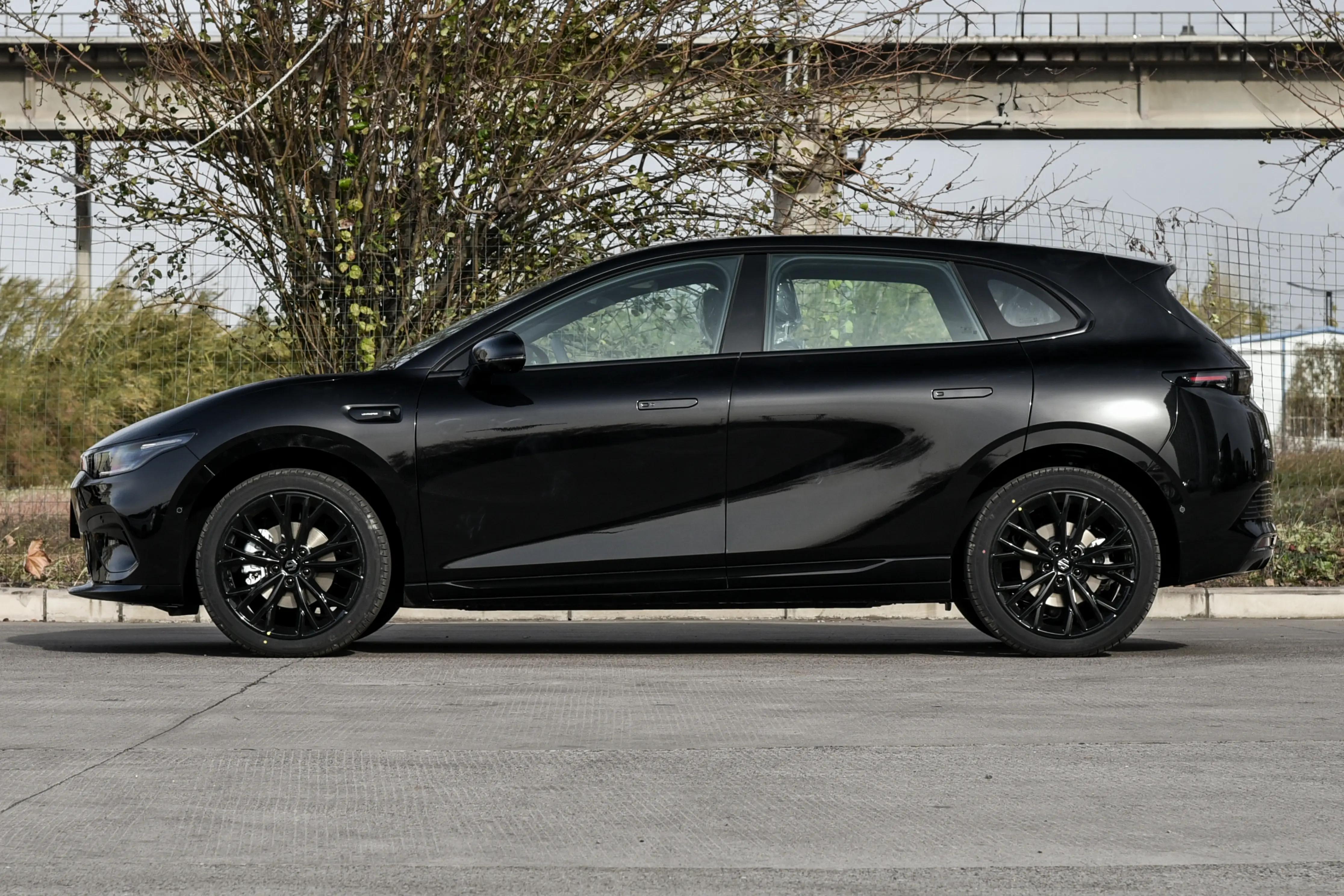 侧面看,19英寸熏黑运动轮毂。车头低趴,车顶下压,腰线上扬,显运动感。车尾,贯穿式尾灯。