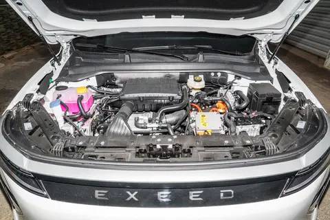 前脸的设计依然延续了家族式风格,采用封闭式造型和黑色中网设计,上方的贯穿式灯带很抢眼。灯带的造型狭长且向两侧延伸,配合黑色运动饰件,整体前脸看起来既简洁又带有科技感。细节上,车头标识“EXEED”英文字符点缀,增加了品牌辨识度。其实,现在很多新能源车型都采用这种封闭式格栅,除了降低风阻,还有助于营造未来感。实拍时,我发现前大灯和尾灯数量多达588颗LED灯珠,这么多灯珠的光效非常细腻,点亮时很有层次感,晚上行车安全性也自然提高了不少。