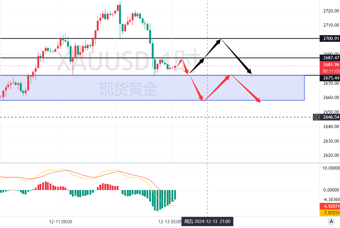 从黄金1小时级别分析,金价在2675点位寻得支撑并展开反弹趋势,向上延伸。尽管上方2687点位可能面临一定的阻力,但观察MACD指标发现,其快速线与慢速线正呈现出形成黄金交叉的态势。然而,值得注意的是,此黄金交叉发生在零轴下方,这可能意味着其推动价格上涨的力度相对有限。因此,预计金价在后续阶段可能会经历一定程度的回调,之后方能再次蓄积力量继续上行。同时,空头动能柱的持续缩减,进一步暗示了金价后续存在继续上涨的潜力。