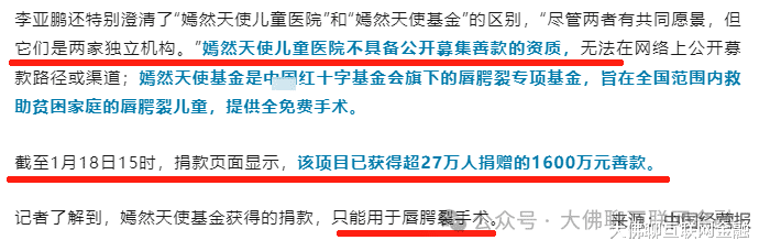 也就是说患儿的唇腭裂手术费用可以用这个钱,但医院的其它业务,比如交房租、物业、给员工发工资等运营成本,是不能动用基金会的钱去支付的,更不可能说拿这个钱去帮李亚鹏还债。