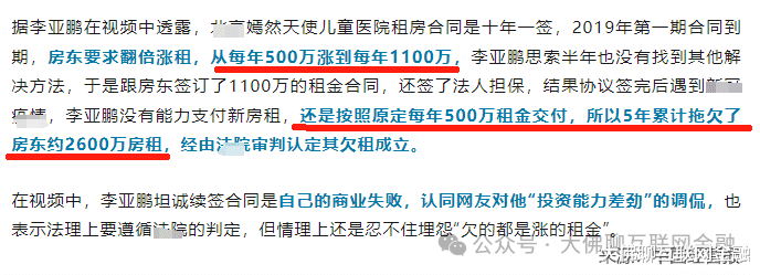 后因特殊时期,医院几乎停摆,也就有了欠租这事。只不过李亚鹏表示,在过去5年已向房东支付了2500万的房租,欠的2600万的租金其实是增长的部分,他也承认确实付不起了。