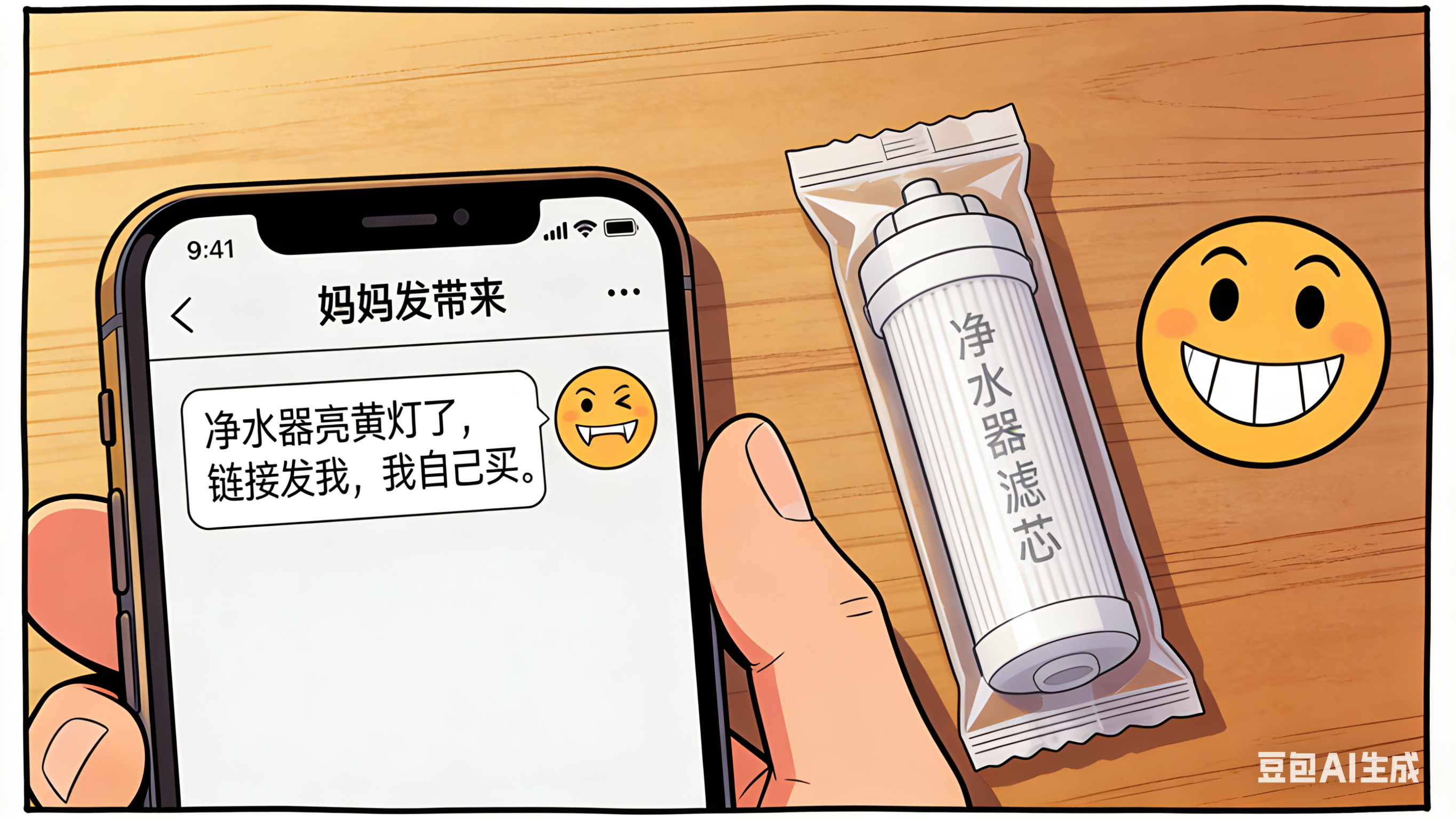 现在我的“24小时客服”工作还在继续,但我早就不觉得是负担了。就在刚才,我妈发来消息:“净水器亮黄灯了,是不是要换滤芯?链接发我,我自己买!”后面还跟了个龇牙笑的表情。看着这条消息,我鼻子一酸,我的“老客户”,终于要出师啦!