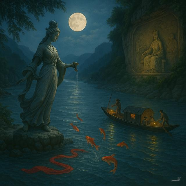 长江由北向南,在此转头向东,渡口西岸的弥陀洞摩崖石刻间,藏着一幅斑驳的《瑶池宴饮图》。据《华阳国志》补遗记载,周穆王西巡时,西王母曾在此处登岸。传说她驻足江畔,以琼浆点化江水,从此江中时有五彩锦鲤跃出。至今每逢端午,渔家仍要往江心抛撒红绸,谓之 "迎王母"。