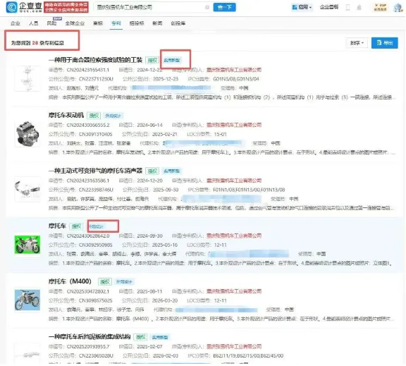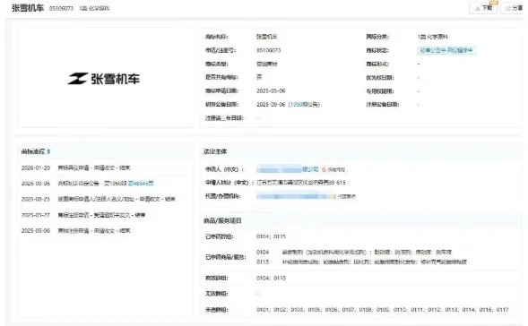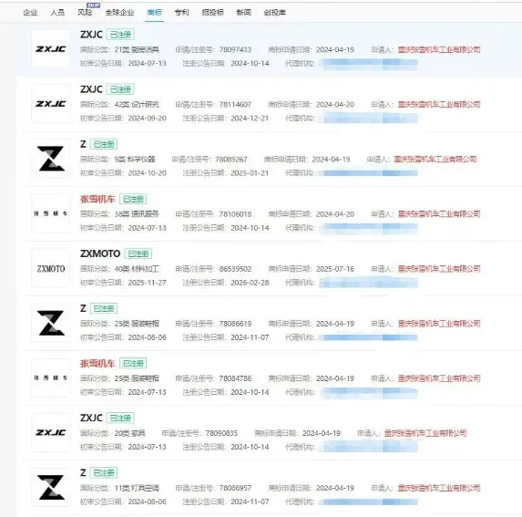 据查询,重庆张雪机车工业有限公司目前拥有26项技术专利,涵盖发明、实用新型与外观设计三大类型,为机车的研发与制造提供了坚实的法律保障。在商标注册方面,张雪机车同样不甘落后,早已展开系统性的商标布局。不仅在第12类(运载工具)等核心类别注册了“张雪机车”与“ZXJC”的文字商标,还随着品牌视觉识别的升级,及时将新设计的LOGO在关键类别上进行了补充注册。