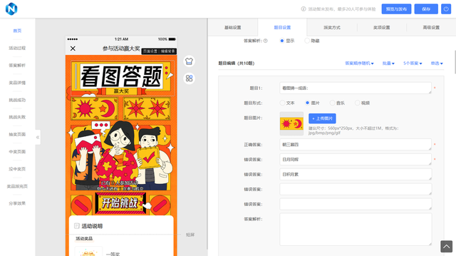 设置猜对奖励(比如猜对 3 个送小样),开启 “分享得额外机会”,让用户分享给好友能多猜 1 题,增加传播性,最后发布即可。