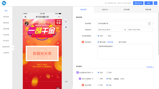 到 “奖项设置”,除了填奖品信息,还能自定义 “刮开区域样式”(默认是灰色涂层,不用改也能用);