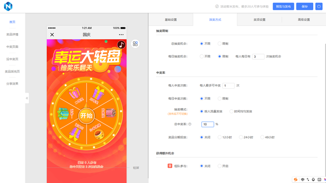 进入模板编辑页,先在 “基础设置” 填活动标题(比如 “国庆大转盘,好礼抽不停”)和活动时间,确认后保存;