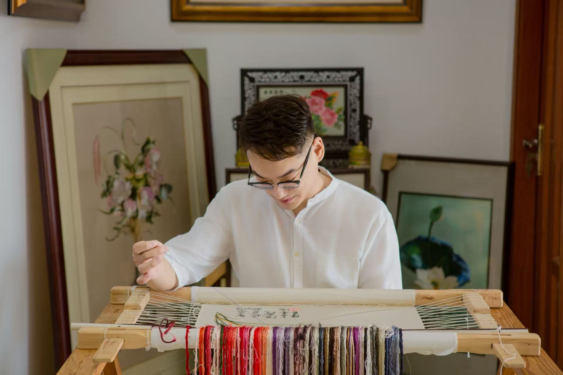 郁宗翰的出现,为沈绣百年传承注入了新鲜的禅意。这位管理学学士,竟是沈绣史上第一位 “男绣娘”,打破了五代皆为女子的传统。最初母亲的反对,世人的不解,都未能阻挡他对针丝的热爱 —— 这份热爱,源于自幼耳濡目染的熏陶,更源于对 “艺无定法”的悟解。