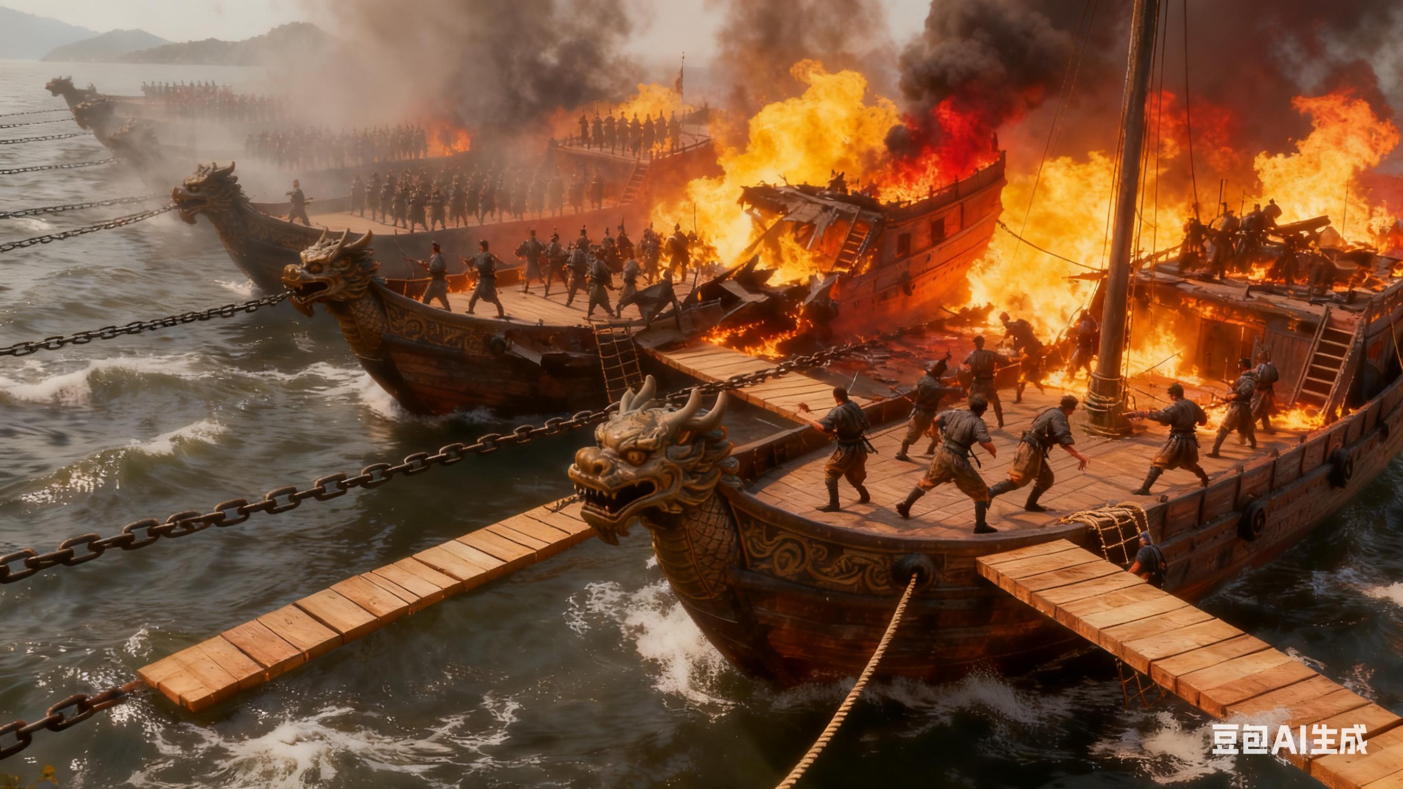 朱元璋立即抓住战机,用小船装满柴草、火药,点燃后直冲敌军,焚烧敌军的战船。